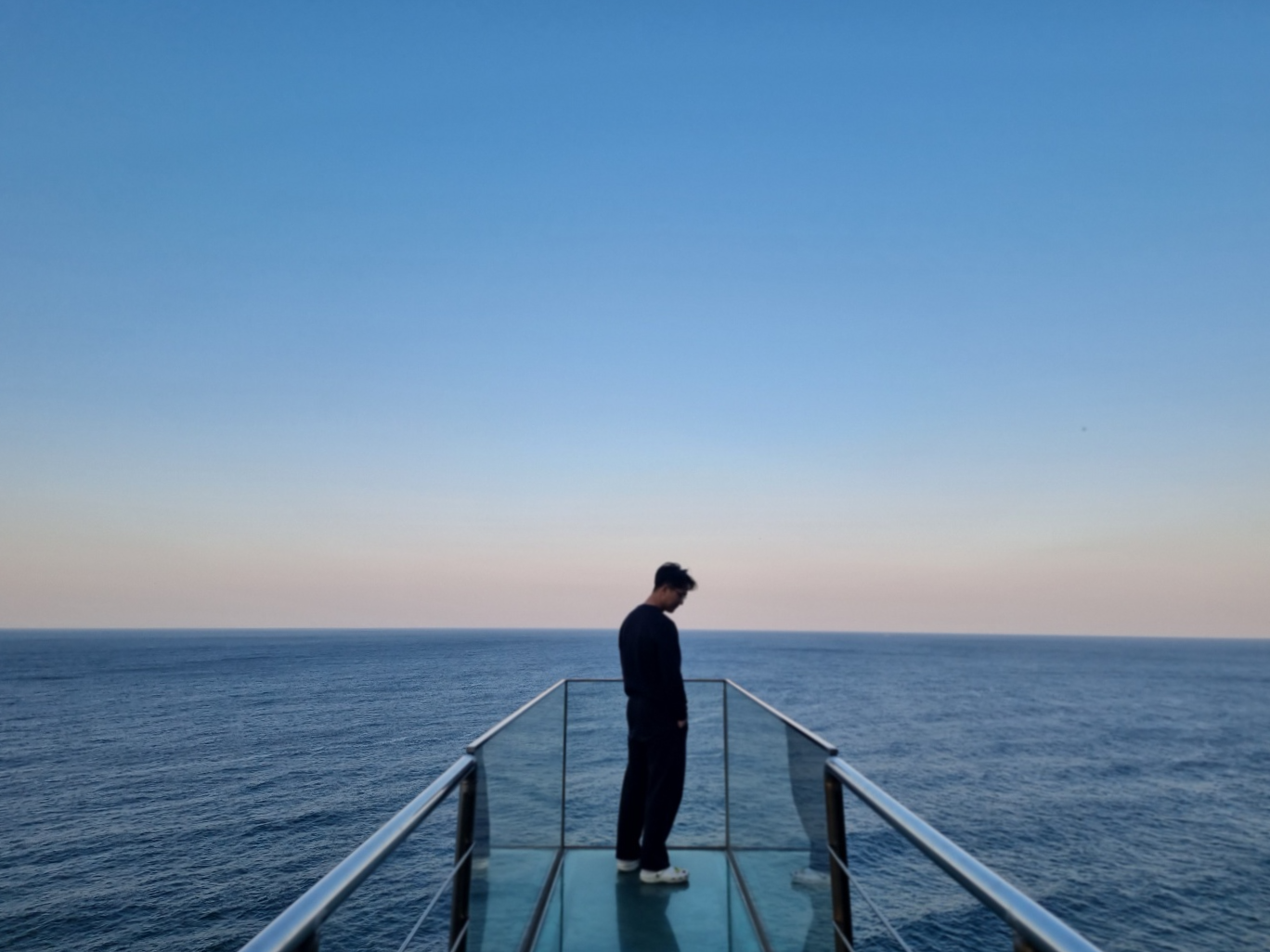 노을이 지고 있을 때라 더 이뻤던 포토존, 투명 유리 전망대다.