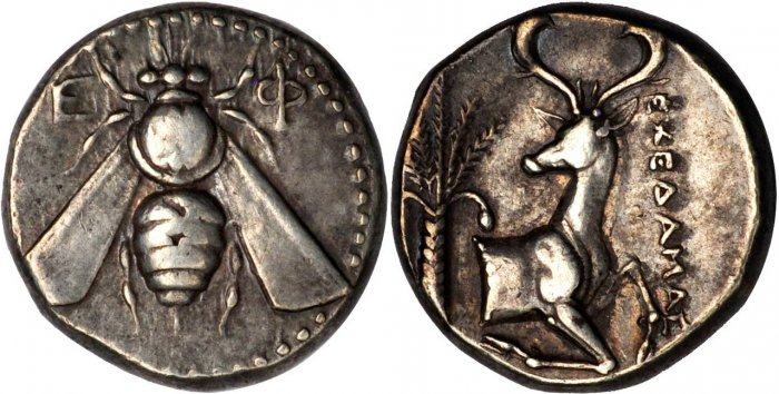 에베소에서 발행된 동전은 결국 그리스와 로마로 퍼져 나갔습니다.